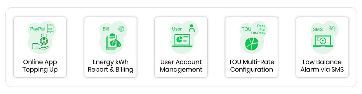 I Réiteach Billeála Acrel IoT EMS, socraíonn bainisteoirí saoráidí taraifí TOU buaice, seachbhuaice agus comhréidh, forfheidhmíonn siad modhanna réamhíoctha nó iar-íoctha, agus sainíonn siad tairseacha íseal-chomhardaithe. Breisiú úsáideoirí trí PayPal, cárta creidmheasa nó aip shoghluaiste; seolann an t-ardán aláraim SMS go huathoibríoch, eisíonn sé billí PDF agus sceidealaíonn sé dícheangal cianda ar chreidmheas nialasach. Déanann deais fíor-ama, fomhéadrú tionóntaí, agus tuarascálacha fuinnimh inchumraithe comhlíonadh ESG agus leithdháileadh costas a shimpliú.