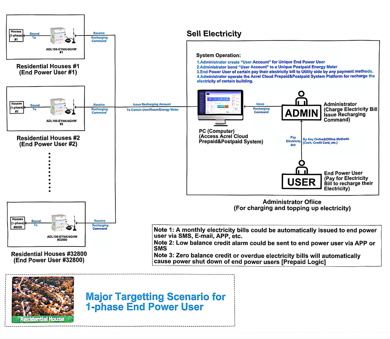 Tá córas billeála réamhíoctha/iaríoctha Acrel saintógtha le haghaidh suanliosanna scoile, ionaid siopadóireachta, páirceanna tionsclaíochta agus eastáit chónaithe. Tosaíonn an ailtireacht trí chiseal le méadair chliste ADL100-EY (aon phas) agus ADL300-EY (trí phas); comhtháthaíonn gach ceann acu sealaíochta maighnéadach-latching 100 A, tacaíonn sé le DL/T 645 agus Modbus-RTU, agus taifeadann kWh le cruinneas Aicme 1.
