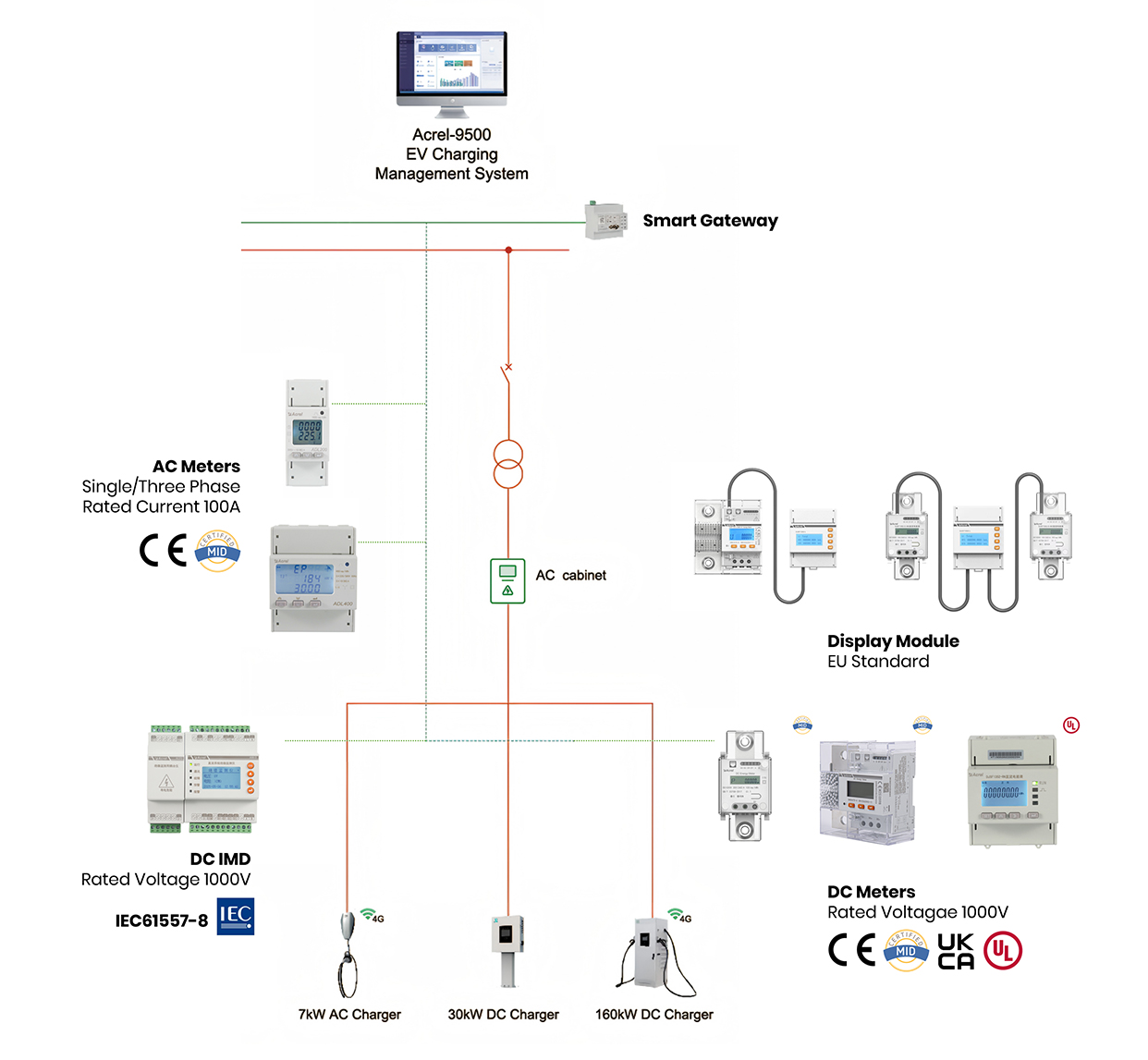 Trí fheistí méadraithe chun cinn a chomhtháthú agus cloí le caighdeáin idirnáisiúnta déine, cinntíonn Acrel tomhas fuinnimh iontaofa agus beacht, ag tacú le glacadh forleathan agus oibriú éifeachtach bonneagair luchtaithe EV.