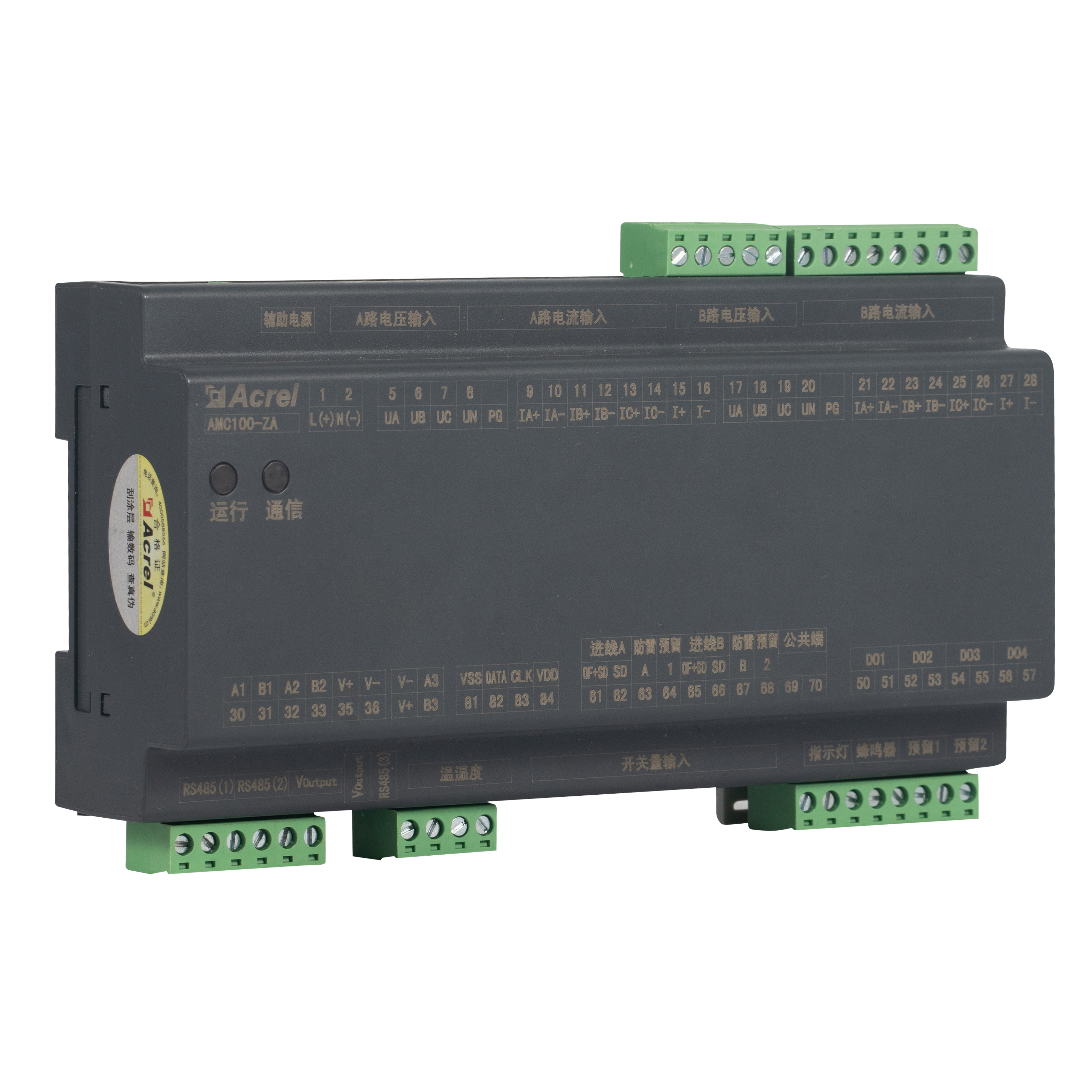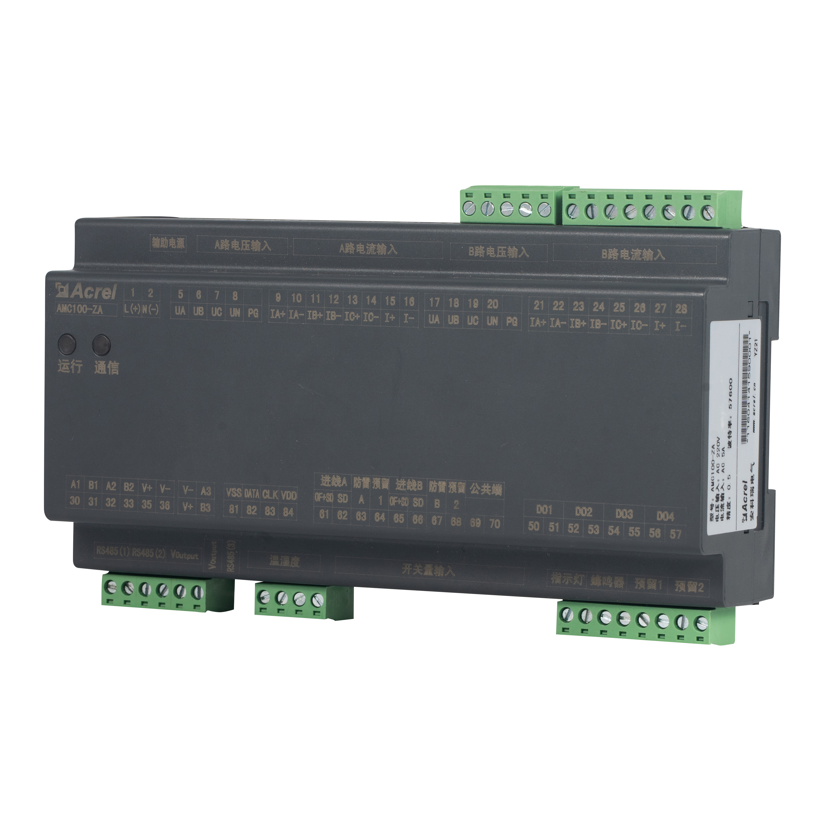 Is é AMC100-ZA aonad monatóireachta cruinneas-dáileadh cumhachta AC DIN-iarnród Acrel a innealtóireacht le haghaidh racaí freastalaí lárionad sonraí. Rianaíonn sé paraiméadair leictreacha iomlána ag an am céanna d’fhothaí dé-trí phas A B, 192 ciorcad amach, 8 pointe stádais DI / 4 DO, 2 chainéal sceite, 1 braiteoir teocht-taise agus 63 armónach. Cumasaíonn trí chalafort RS485 Modbus-RTU comhtháthú BMS/DCIM gan uaim. Tithíocht dhlúth 180 mm, cruinneas ± 0.5 %, tairseacha aláraim in aghaidh an chainéil agus slais rabhaidh toirt-sholais ar dhramhaíl fuinnimh agus aga neamhfhónaimh, rud a fhágann gurb é croí inscálaithe busbhealach AC lárionad sonraí glas nó réitigh monatóireachta PDU.