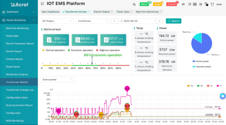 2. Amharcléiriú oibríocht claochladáin: Déanann an t-ardán monatóireacht leanúnach ar pharaiméadair ríthábhachtacha (reatha, voltas, fachtóir cumhachta, etc.), ag cinntiú go n-oibríonn claochladáin laistigh de theorainneacha ualaigh sábháilte agus go laghdaítear an baol ró-ualaithe agus damáiste.
